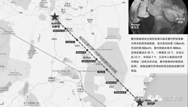 蒙內鐵路全長483KM,是肯尼亞近百年來新建的首條鐵路。鐵路起點為蒙巴薩,是非洲最大的港口之一,也是鄭和下西洋時抵達東非的重要港口。終點為內羅畢,是肯尼亞政治、經濟、文化中心,非洲重要的交通樞紐。