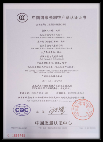 低壓成套抽出式開關(guān)設(shè)備認(rèn)證證書